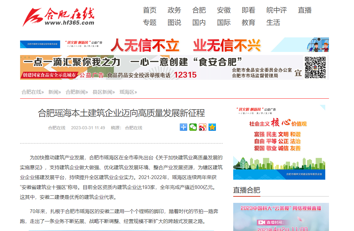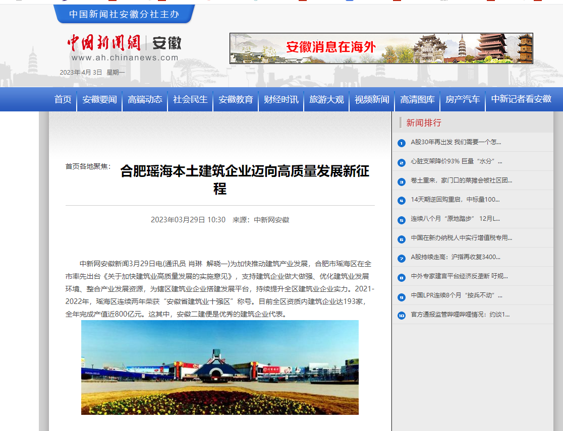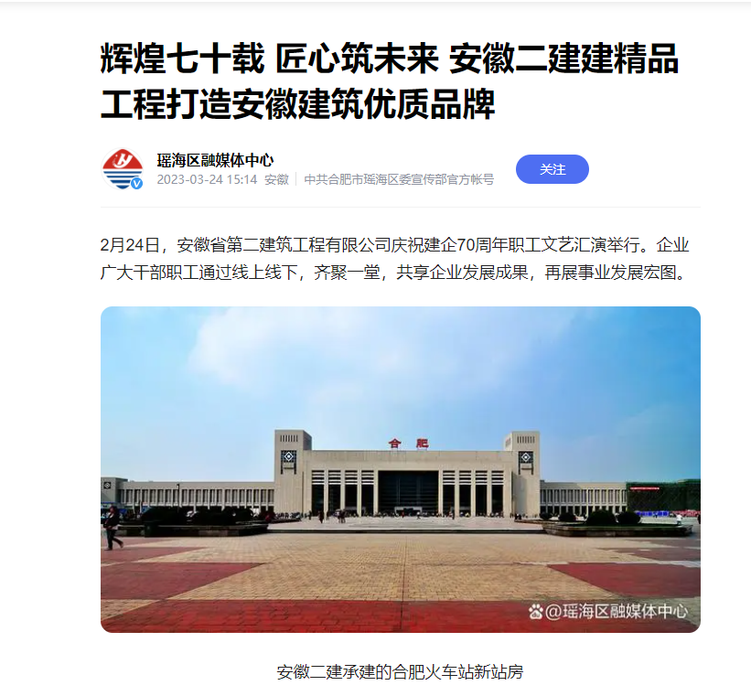 近日,新华网安徽频道、中国商报网、中新网安徽频道、市场星报、合肥在线、今日头条-瑶海宣传、瑶海区融媒体中心、金台资讯、网易新闻、搜狐新闻、腾讯网、大公网等多家平台媒体相继报道安徽二建公司70周年发展成就。