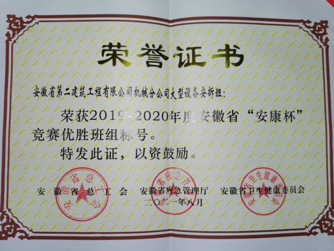 2019-2020年“安康杯”优胜竞赛班组--安徽二建机械分公司安拆班