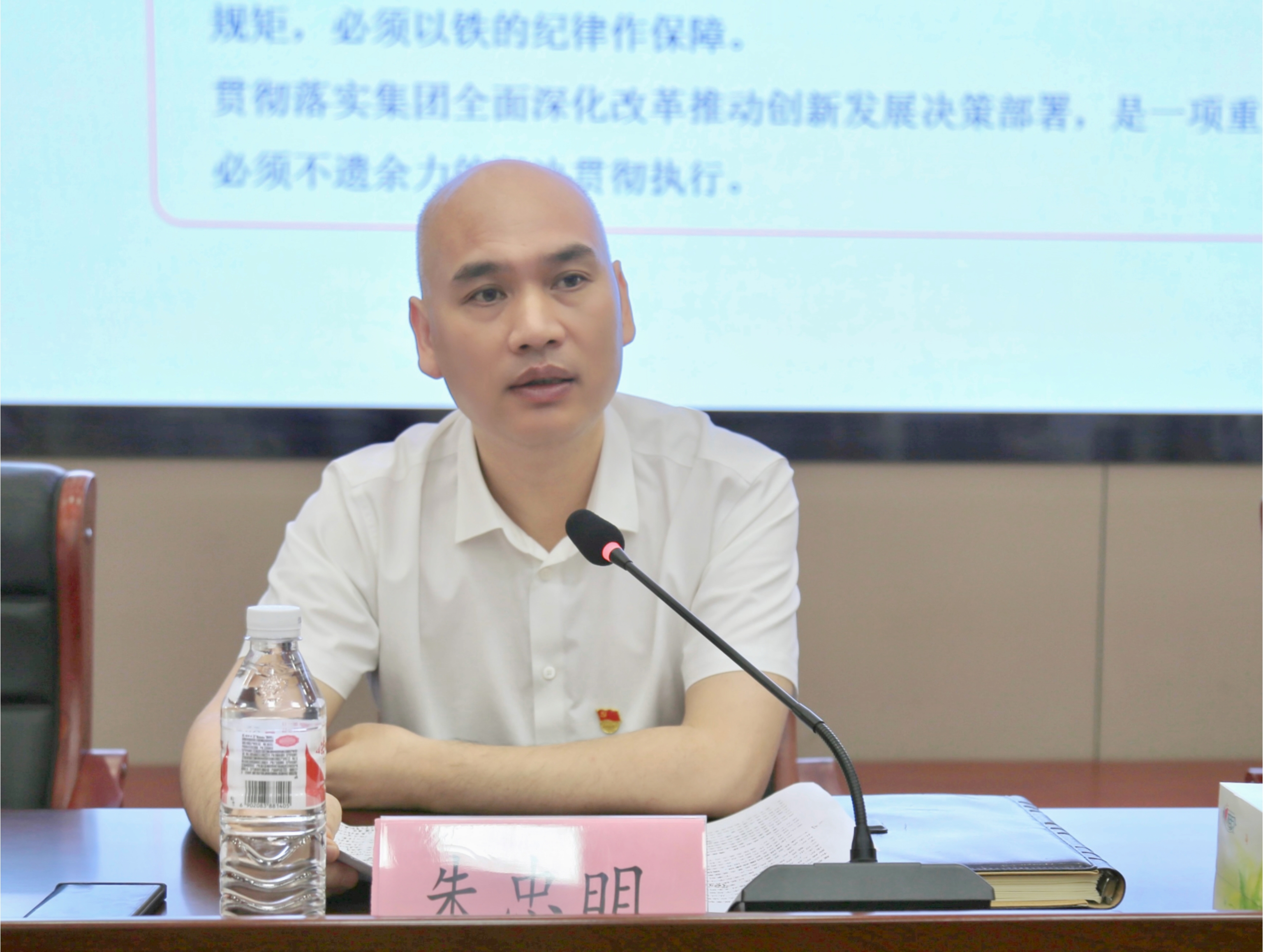 朱忠明作题为《遵规守纪 严于律己 以身作则 营造风清气正、干事创业的良好氛围》专题党课,从四个方面展开:一是扎实开展党纪学习教育,强化党员干部纪律意识。二是纪律建设要融入企业治理,推进党风廉政建设。三是认清形势任务,营造风清气正的干事氛围。四是坚持真抓实干,扎实做好年度各项重点工作。