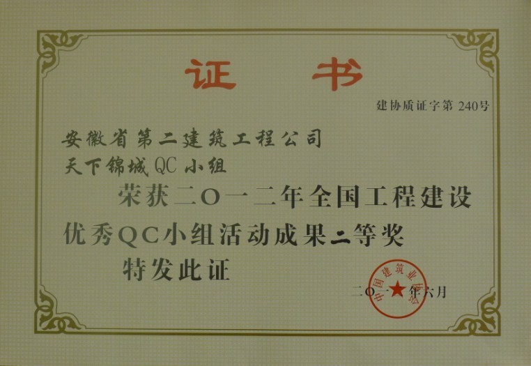 近日,从2012年度全国工程建设优秀质量管理(QC)小组评审表彰会上传来好消息,二公司质量技术处QC小组《提高外墙柔性面砖施工合格率》课题从众多项目成果中脱颖而出,经国家工程建设质量奖审定委员会审定,荣获中国建筑业协会工程建设质量管理分会“2012年度全国工程建设优秀QC小组活动成果”二等奖,并获颁优秀成果证书及奖牌。该课题还荣获安徽省建设工程优秀QC小组一等奖。