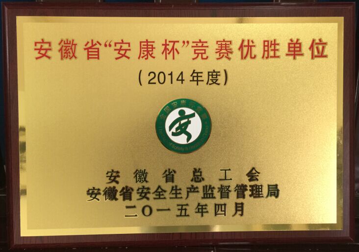 日前,在安徽省总工会和安徽省安全生产监督管理局组织开展的以“广泛发动提质量,文化引领强基础”为主题的“安康杯”竞赛活动评比中,我公司被授予2014年度安徽省“安康杯”竞赛先进单位光荣称号。