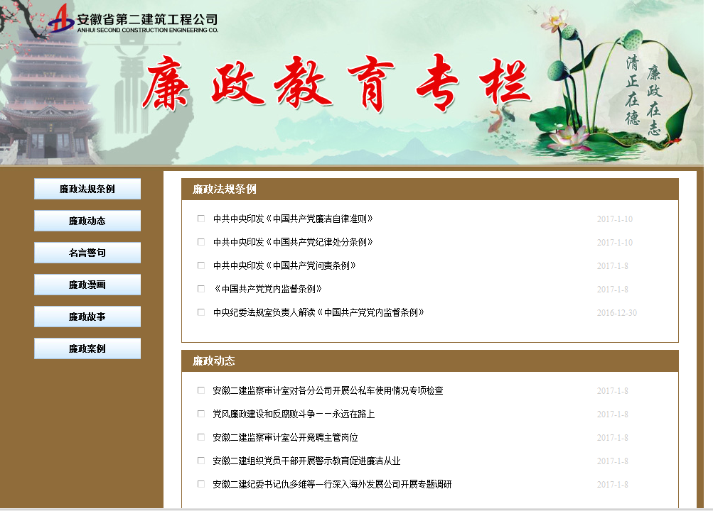 该专栏以公司网站为依托,设有廉政法规条例、廉政动态、名言警句、廉政漫画、廉政故事、廉政案例六大板块。通过廉政法规条例,转载《中国共产党廉洁自律准则》、《中国共产党纪律处分条例》、《中国共产党问责条例》、《安徽省预防职务犯罪条例》等一系列党纪党规、国家法律法规知识,并在每一次修订后及时更新,为广大党员干部学习使用提供方便。运用廉政动态,及时发布集团纪委和公司党委、纪委通知要求,通报监察审计事项与结果,做到监督的公开化、透明化。以名言警句、廉政漫画、廉政故事、廉政案例感染人、陶冶人,内容直观形象,用勤廉典型激励人,深入剖析典型违纪案例,加强警示教育。