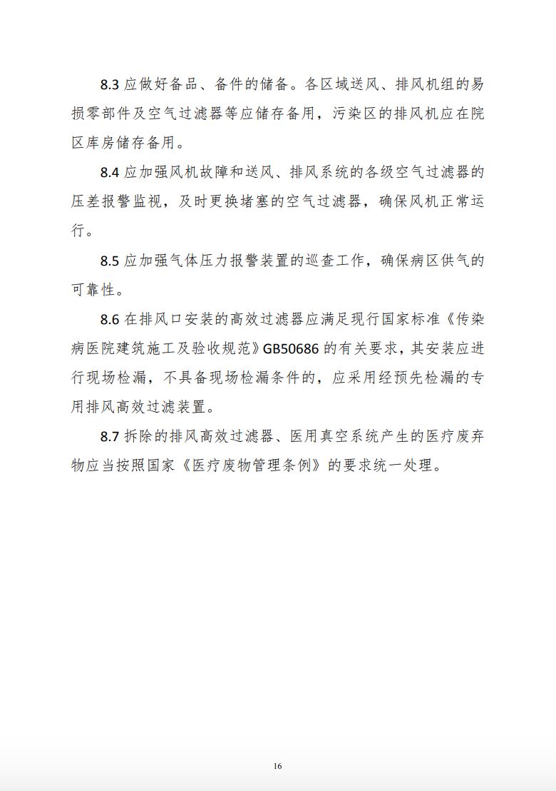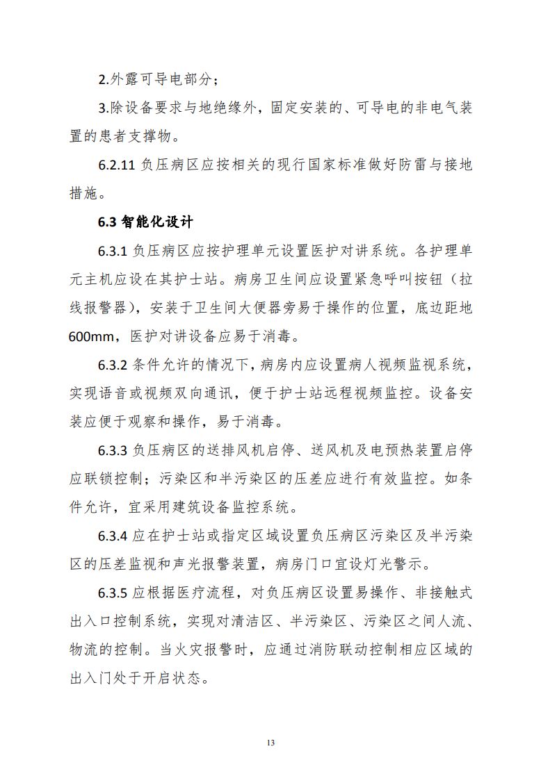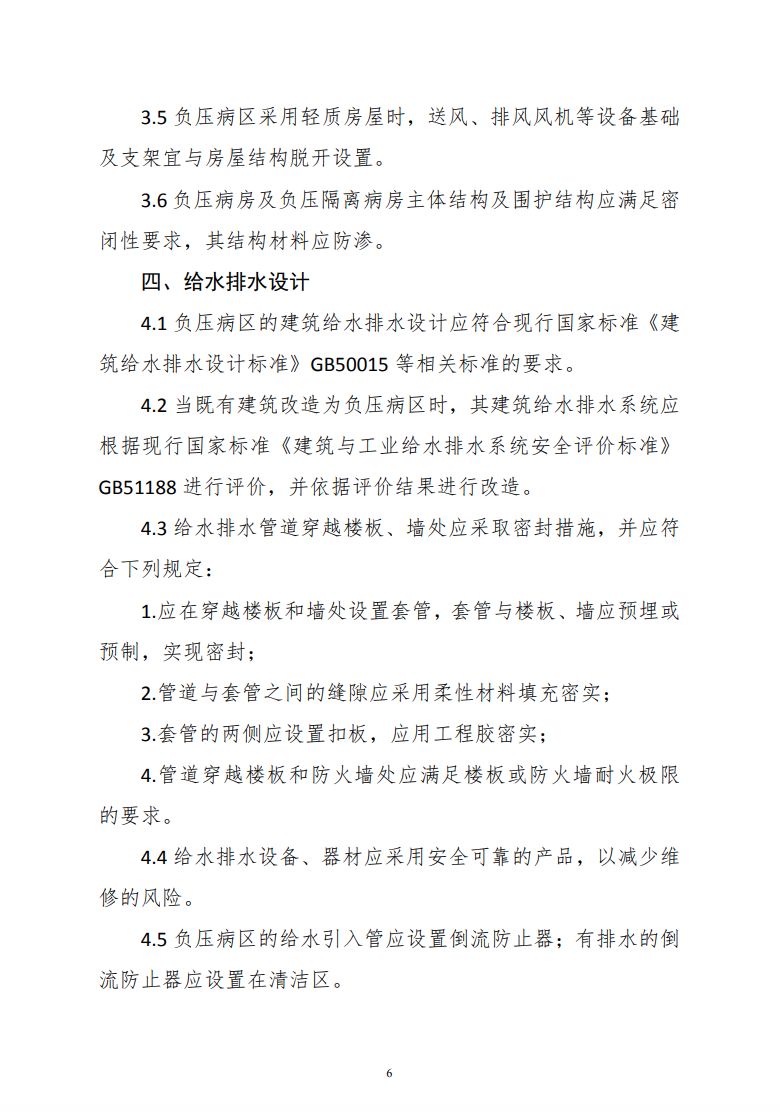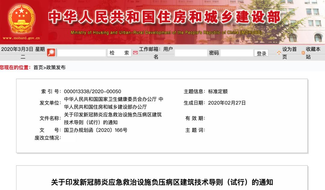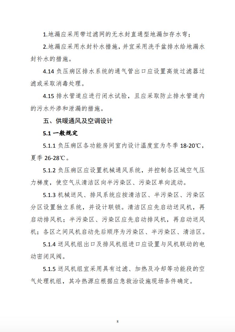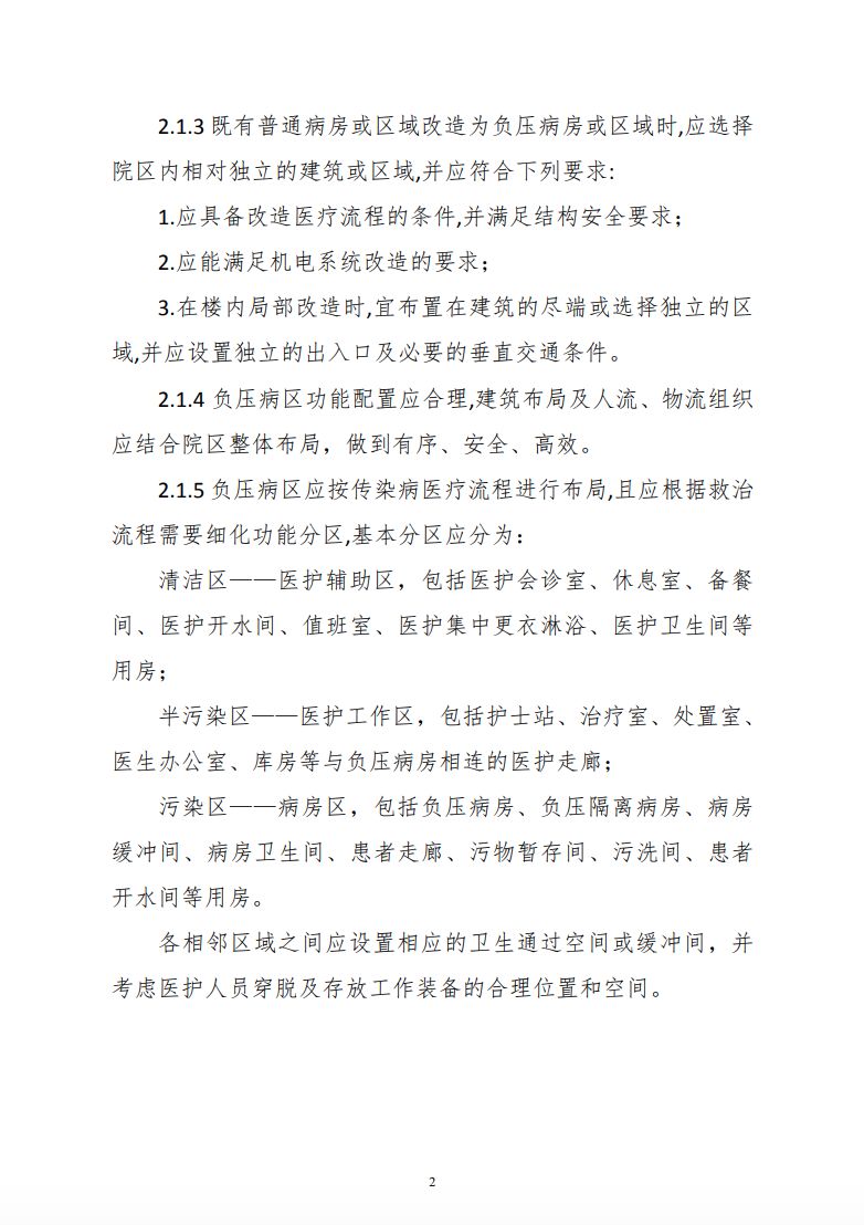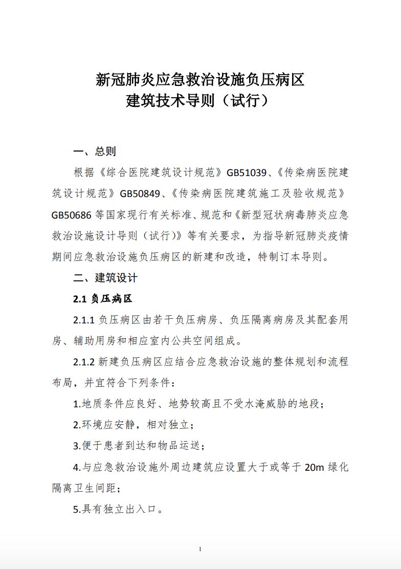 为进一步做好新冠肺炎疫情防控工作,加强新冠肺炎应急救治设施建设,国家卫健委办公厅、住房和城乡建设部办公厅近日联合印发《新冠肺炎应急救治设施负压病区建筑技术导则(试行)》,供各地结合防疫工作和实际需要参考执行。导则包括建筑设计、结构设计、给水排水设计、供暖通风及空调设计、电气及智能化设计、运行维护等8个方面。